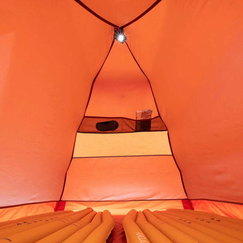 1 abside frontale de 60 cm de profondeur peut accueillir 2 sacs à dos de 50 litres environ, ainsi que 2 paires de chaussures de randonnée. Cet espace permet d’organiser et de ranger votre matériel de bivouac. 2 poches dans la chambre, 1 crochet sommital intérieur pour pendre une lampe.